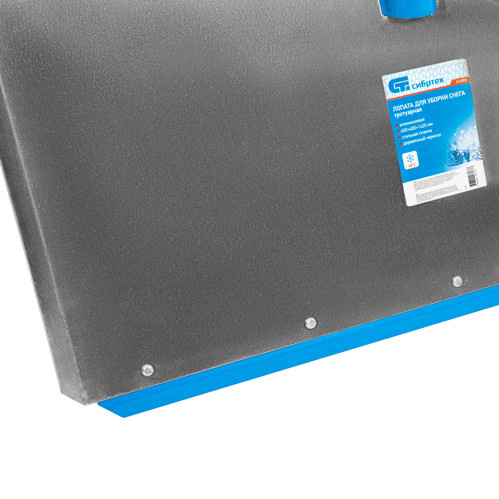 Алюминиевая тротуарная лопата Сибртех 61490 размером 600 х 400 х 1420 мм, с деревянным черенком, подходит для расчистки тротуаров и уборки снега. Увеличенная толщина полотна 1,5 мм и стальная накладка придают ковшу устойчивость к интенсивным нагрузкам, поэтому лопата эффективно справляется с настом и крупными комьями снега.