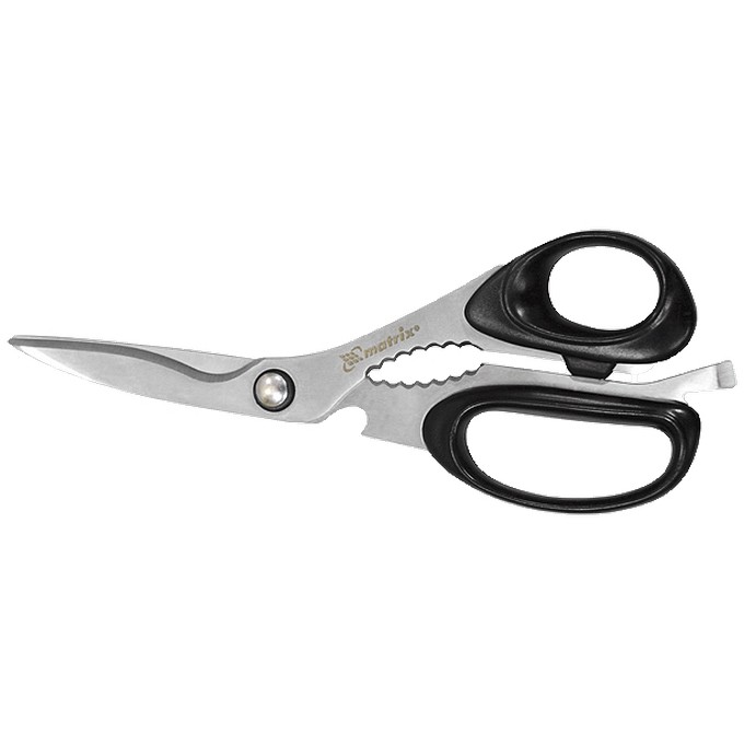 Многофункциональные хозяйственные ножницы Matrix Kitchen 79136 длиной 200 мм способны решить множество бытовых задач. Будут полезны на кухне, а также во время занятий рукоделием или мелким ремонтом. Режут бумагу, картон и ткань, разделывают птицу или рыбу, а также выполняют функцию отвертки. Изогнутая форма повышает комфортность использования инструмента.
