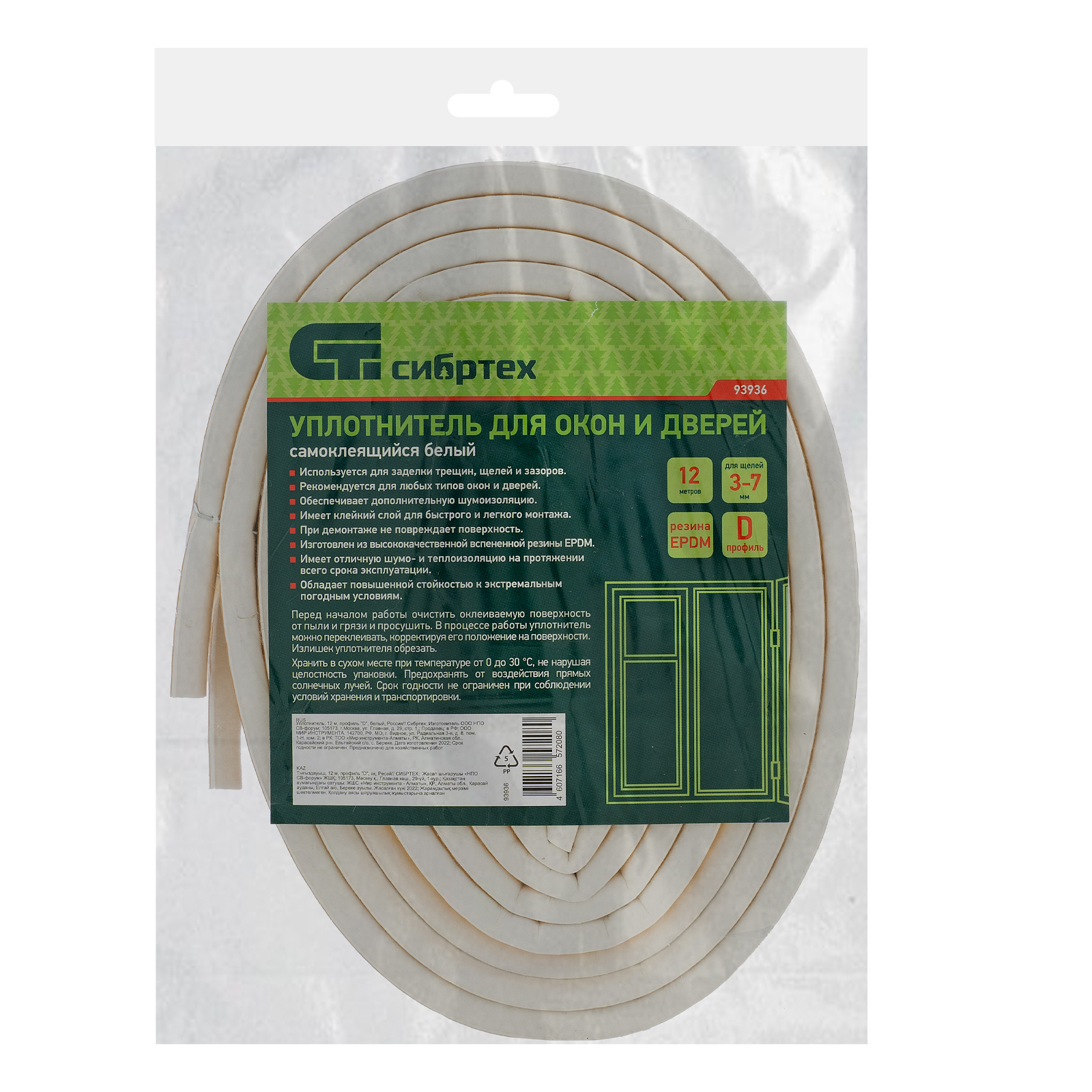 Белый уплотнитель Сибртех 93936 с профилем «D», длиной 12 м, предназначен для герметизации зазоров шириной 3-7 мм в оконных рамах и дверных блоках. Защищает от шума, пыли, влаги, а также сохраняет тепло в помещении.