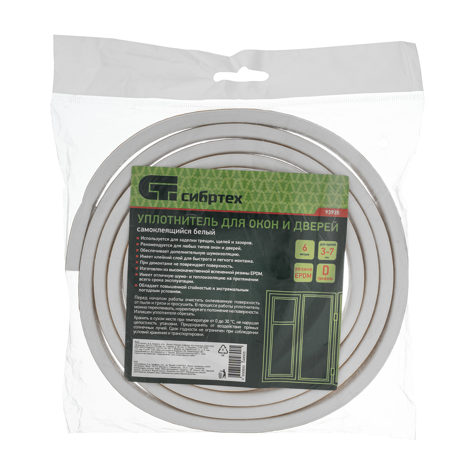 Уплотнитель, 6 м, профиль "D", белый, Россия Сибртех