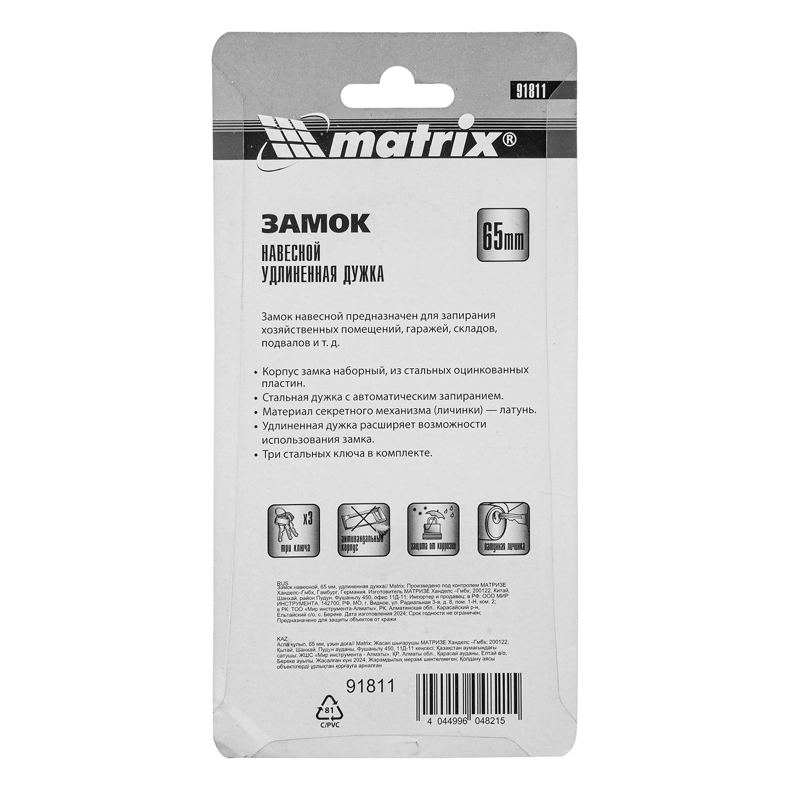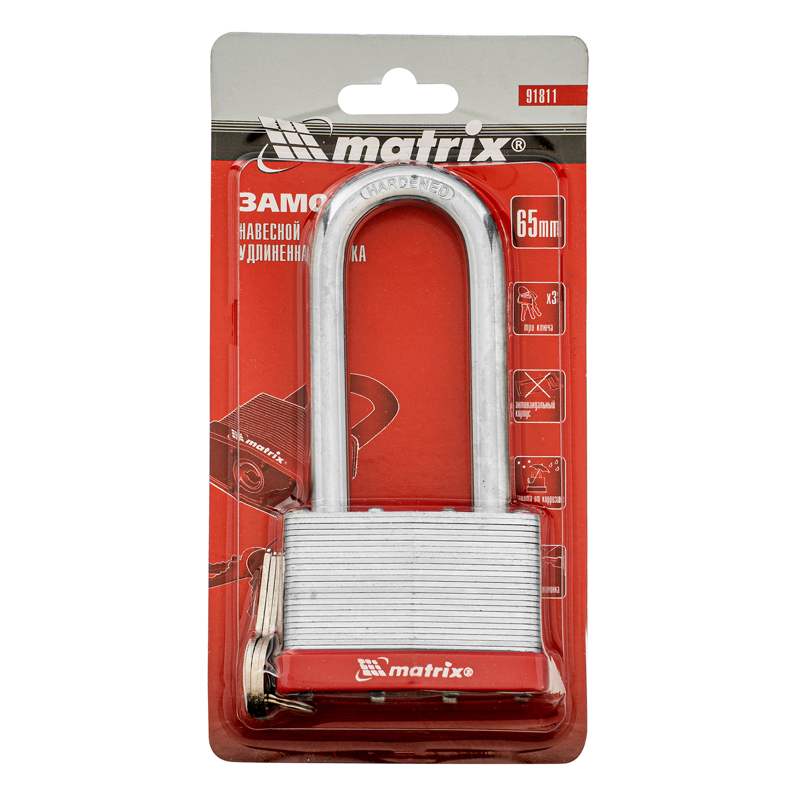 Замок навесной, 65 мм, удлиненная дужка Matrix