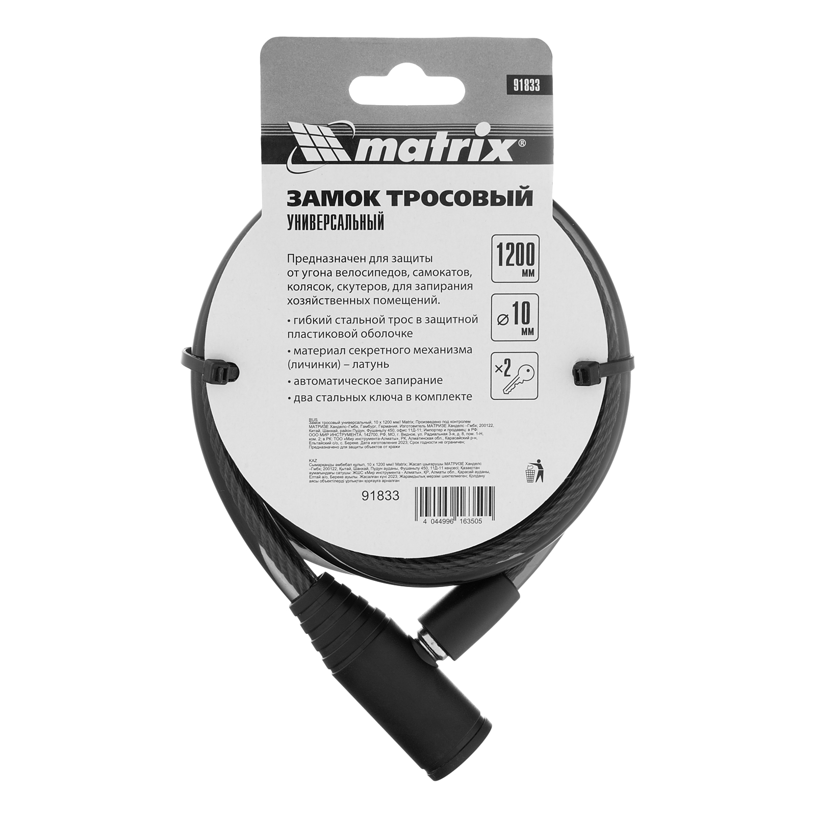 Универсальный тросовый замок Matrix 91833 размером 10 х 1200 мм позволяет обезопасить имущество от кражи. С его помощью можно пристегнуть велосипед, мопед, коляску и другие транспортные средства к неподвижной опоре, а также защитить помещение от взлома.