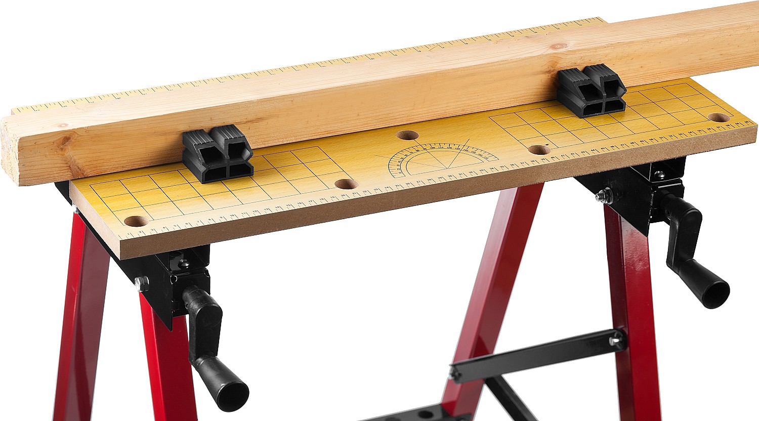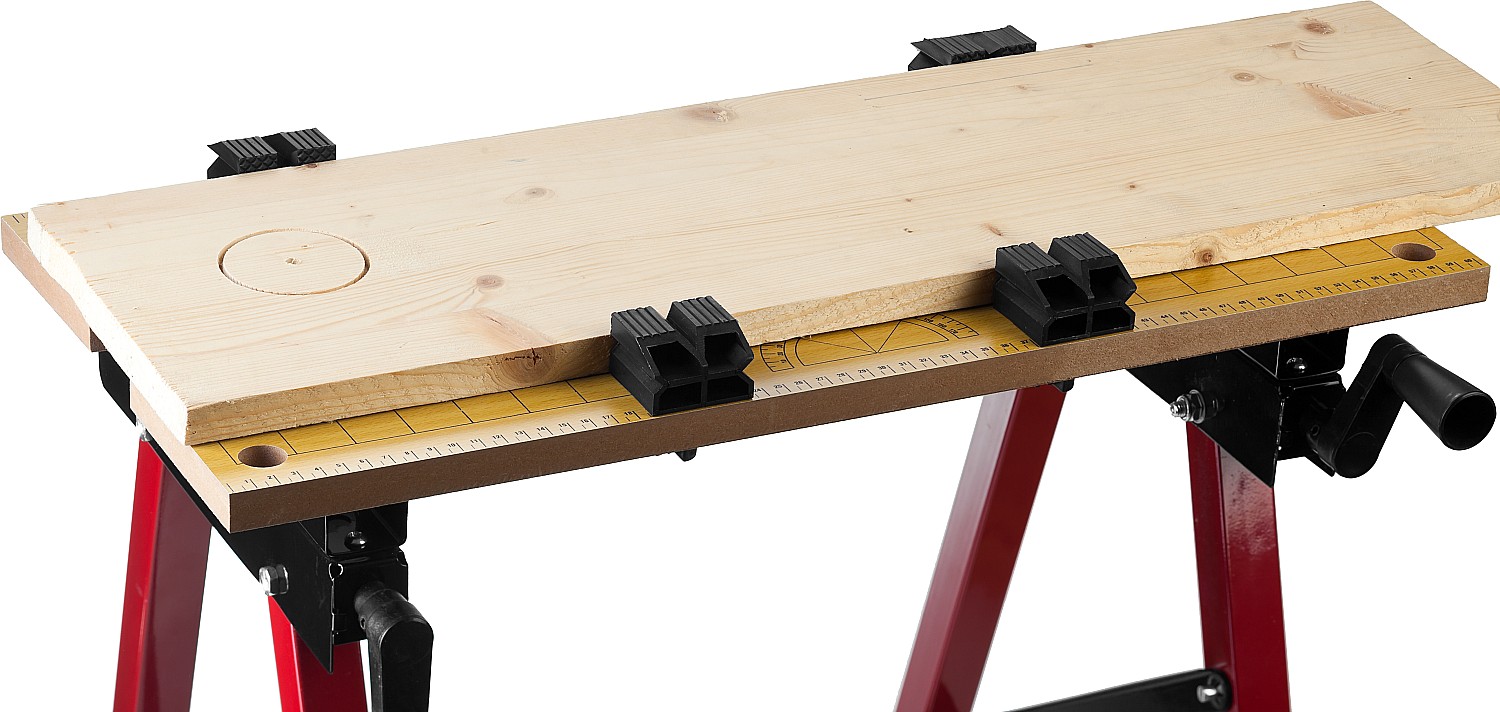 Незаменимый помощник в мастерской, в гараже и в домашних условиях. Предназначен для проведения столярных работ. Благодаря складному каркасу удобен в хранении и транспортировке. Столешница состоит из статической и подвижной части, фиксируемой двумя вращающимися ручками. Для удобства в работе столешница оснащена отверстиями и фиксаторами заготовок любой формы.