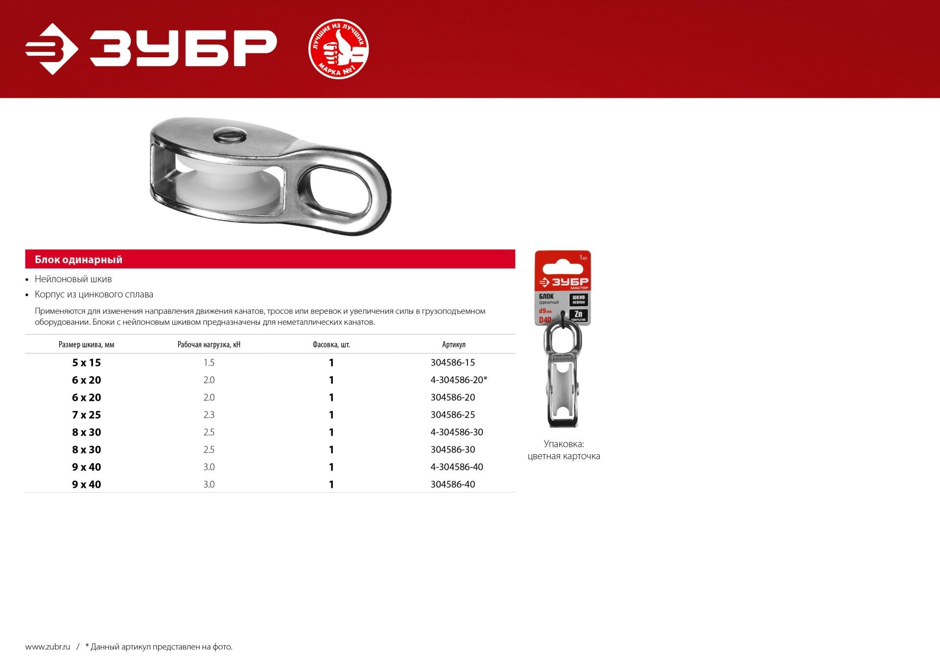 Блок одинарный, 5x15мм, 1 шт, нейлоновый шкив, ЗУБР