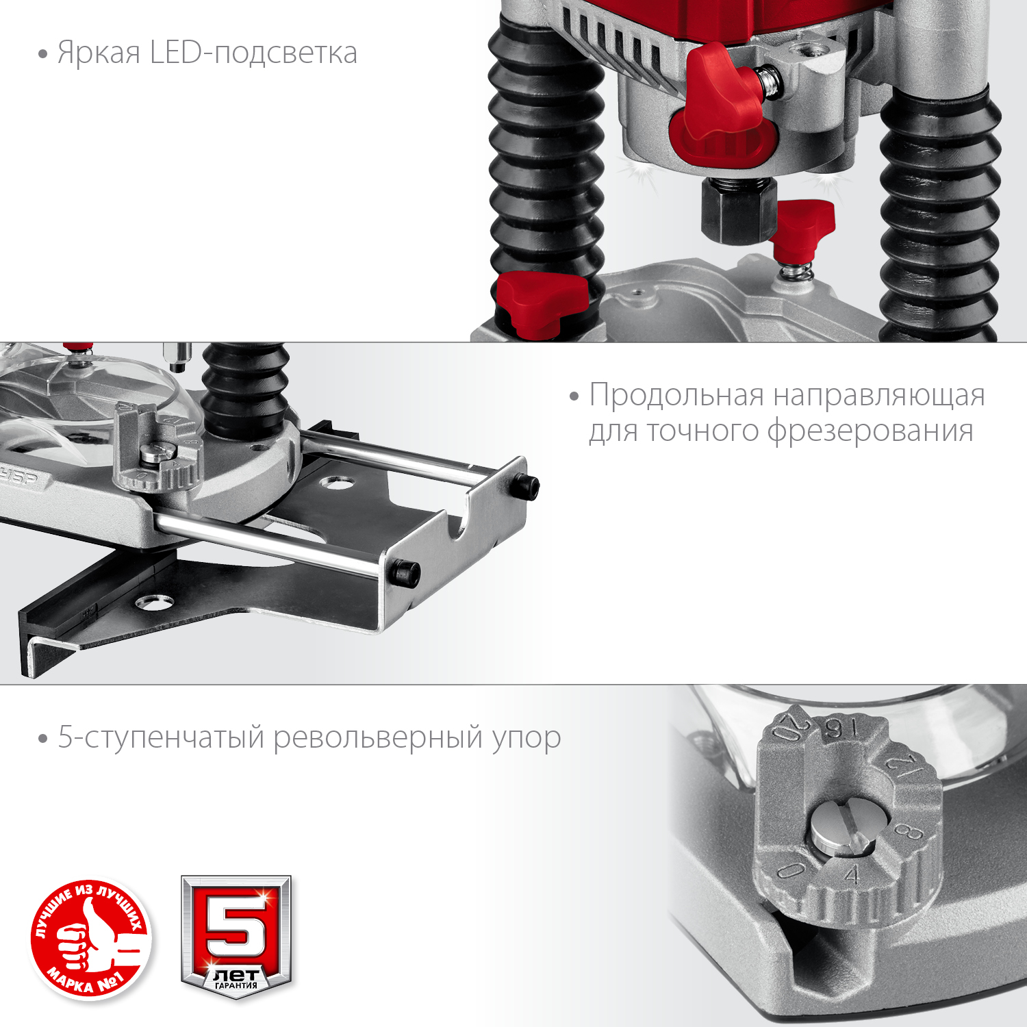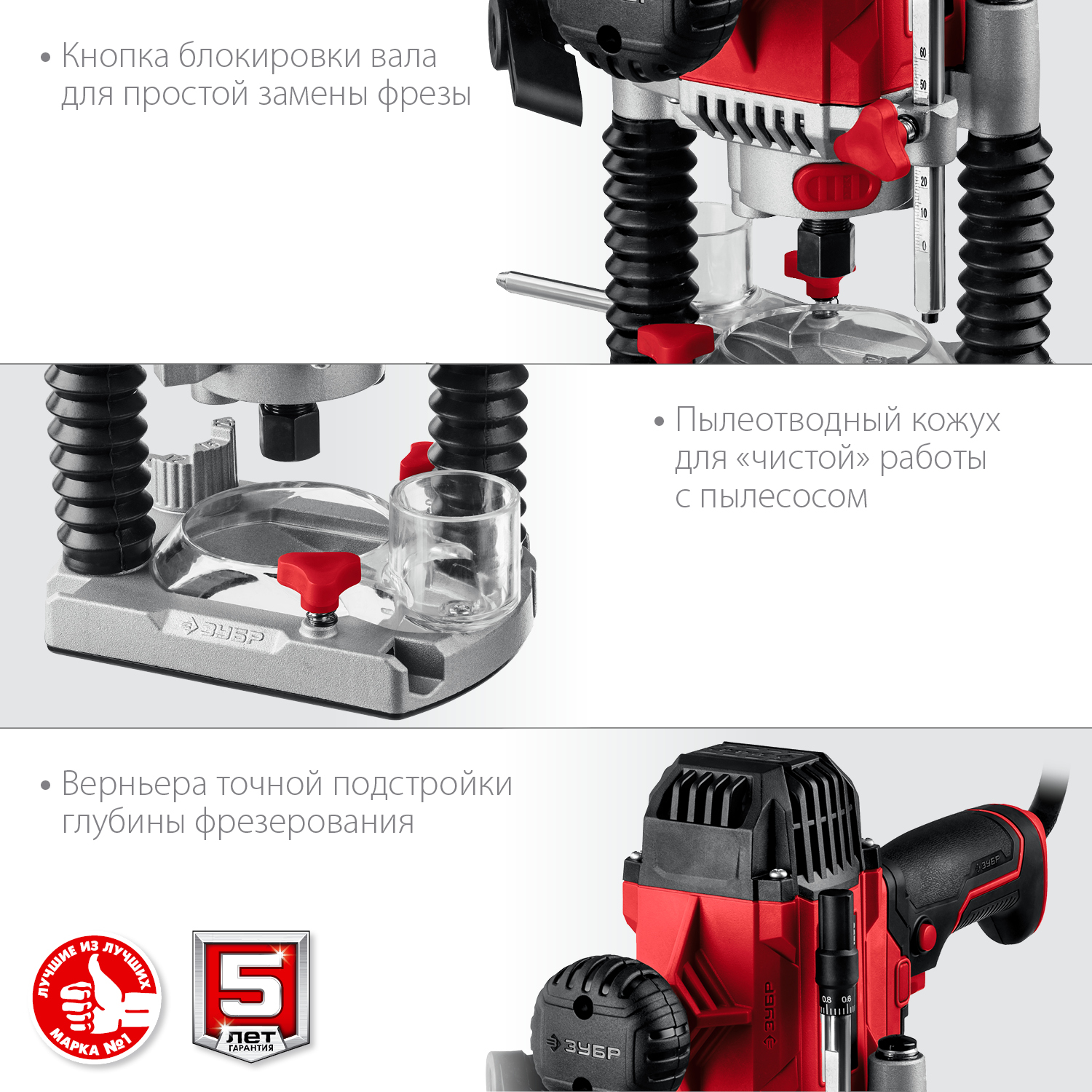 Фрезер ЗУБР – многофункциональное изделие для различных видов фрезерования (продольного, фигурного, по шаблону, по радиусу). Компактный и производительный инструмент с удобной эргономикой. Повышенная точность оперирования позволяет выполнять наиболее тонкие работы. Яркая подсветка места фрезерования способствует удобству в работе