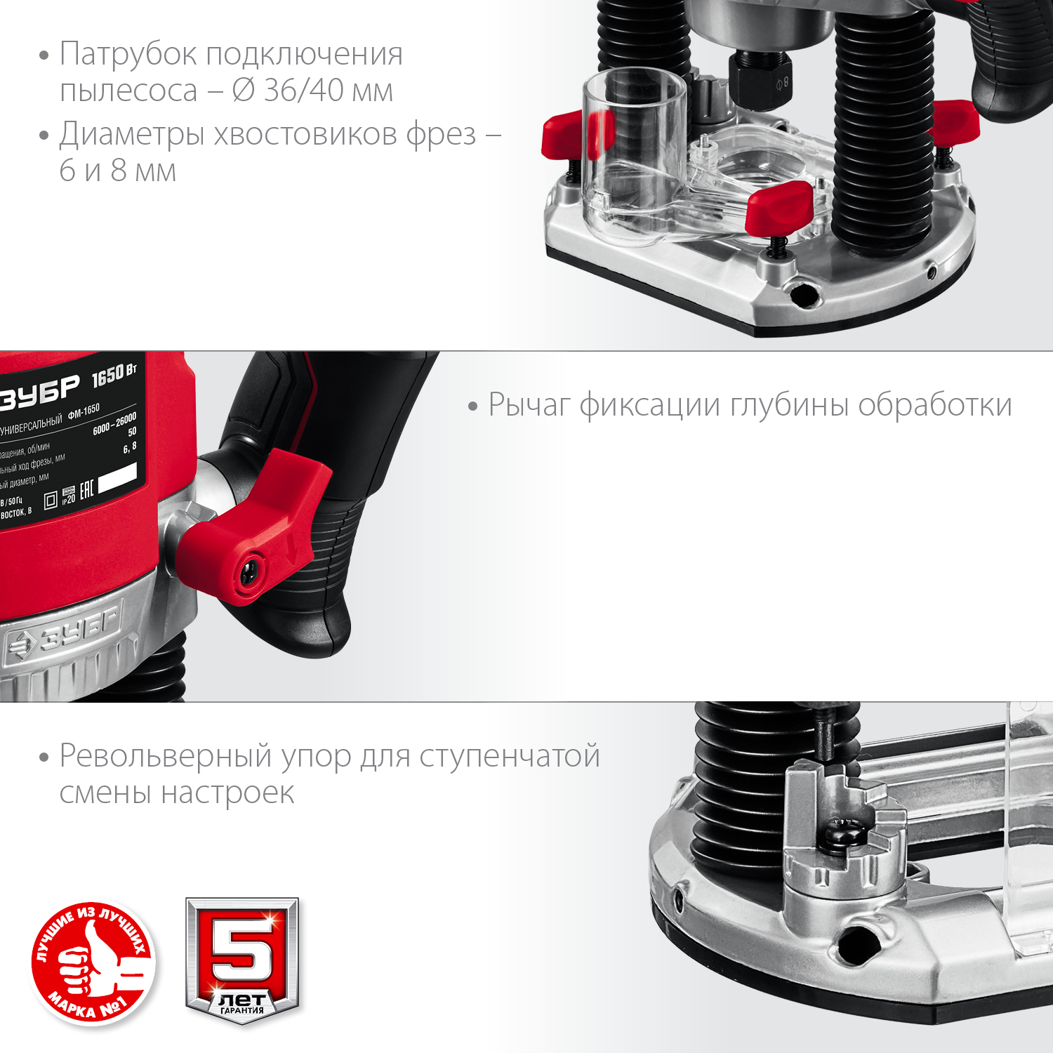 Фрезер ЗУБР – многофункциональное изделие для различных видов фрезерования (в т.ч. фигурного, по шаблону, по радиусу). Достаточная мощность и большая глубина фрезерования (50 мм), точная настройка глубины обработки, два вида цанг для установки различных фрез, точный выбор оборотов, полный комплект принадлежностей для начала работа