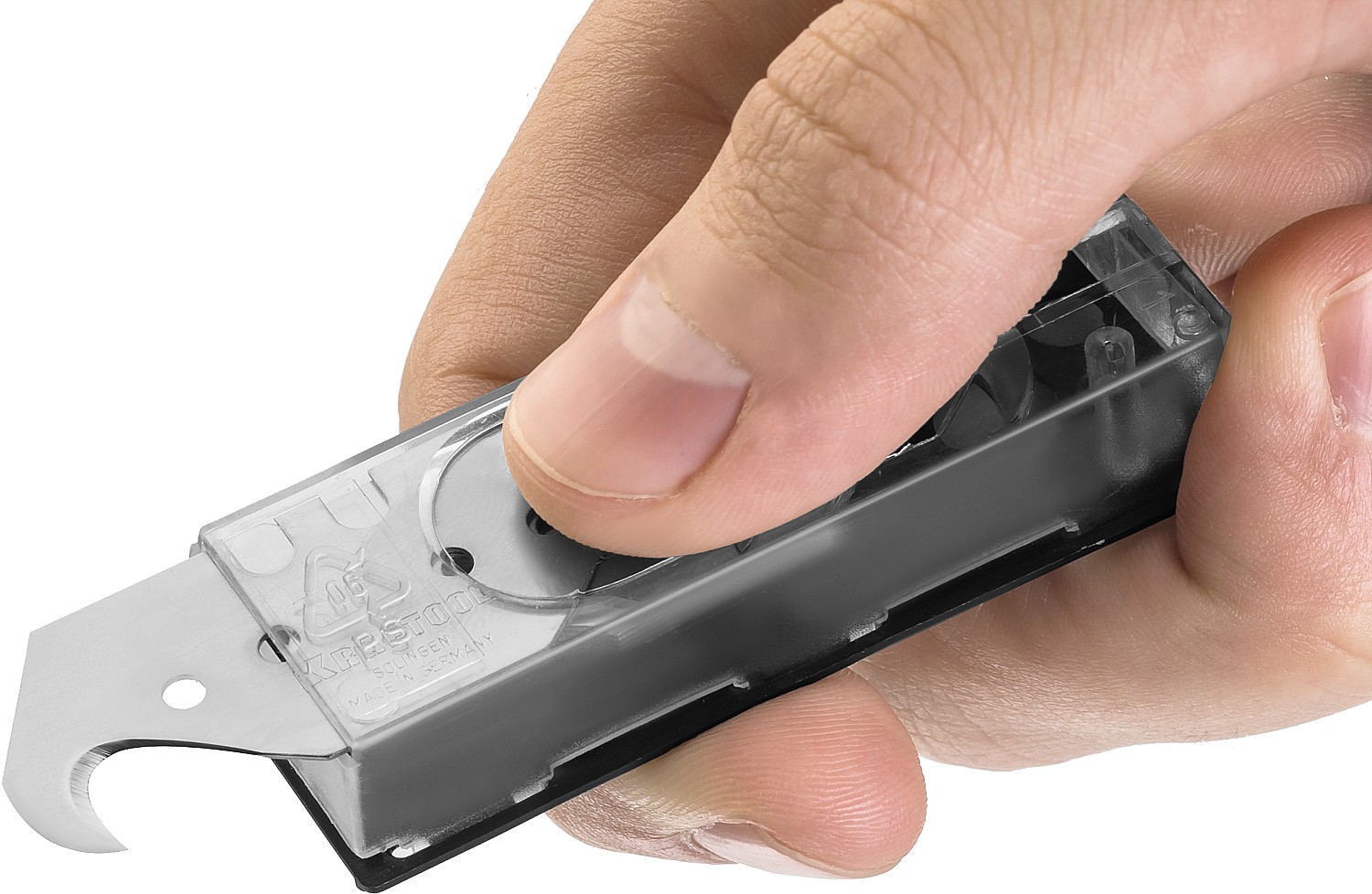 - -Крюковидная форма лезвия позволяет выполнять рез, не повреждая поверхность под материалом,