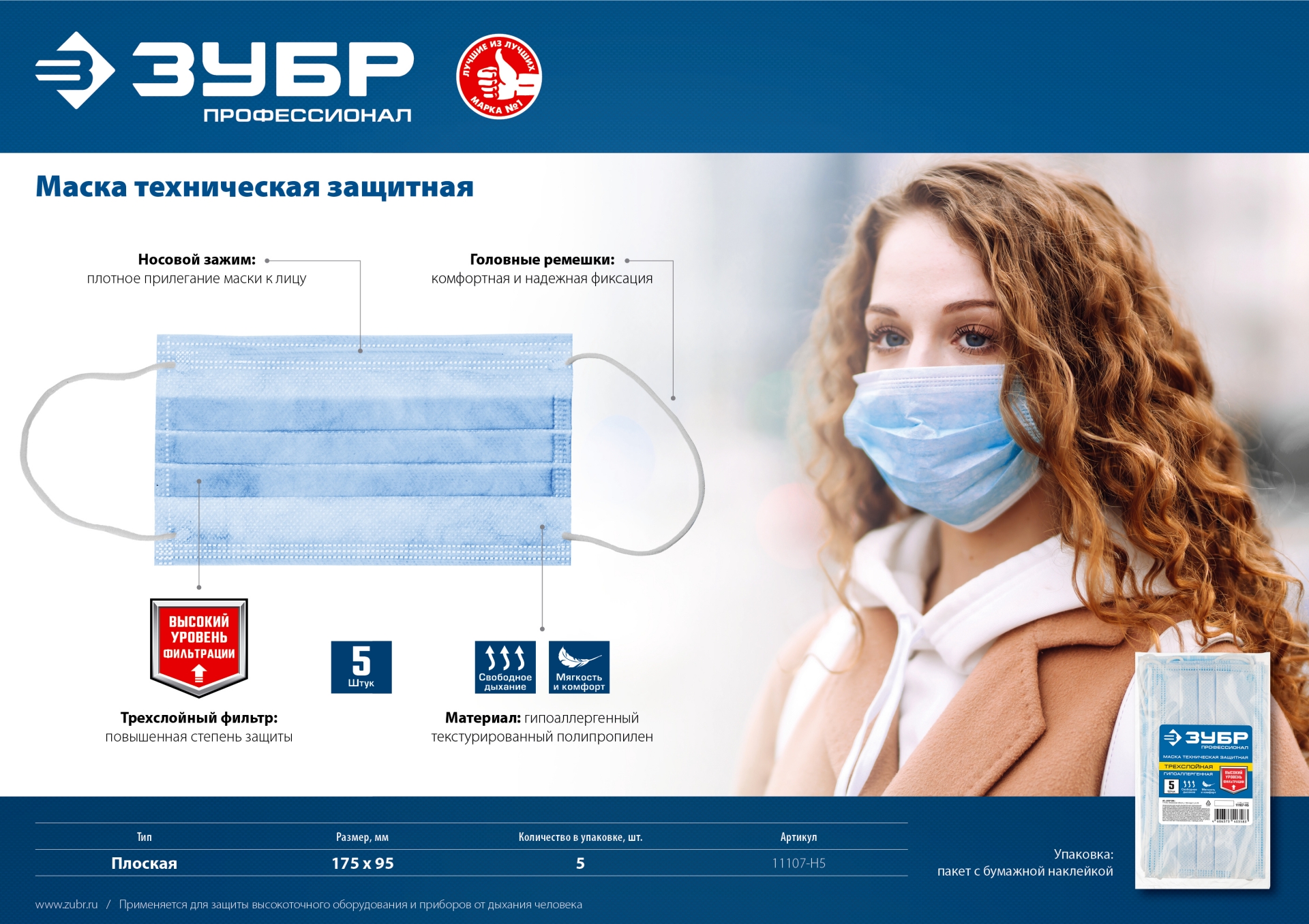 Маска техническая защитная, гигиеническая, трехслойная ЗУБР 5 шт