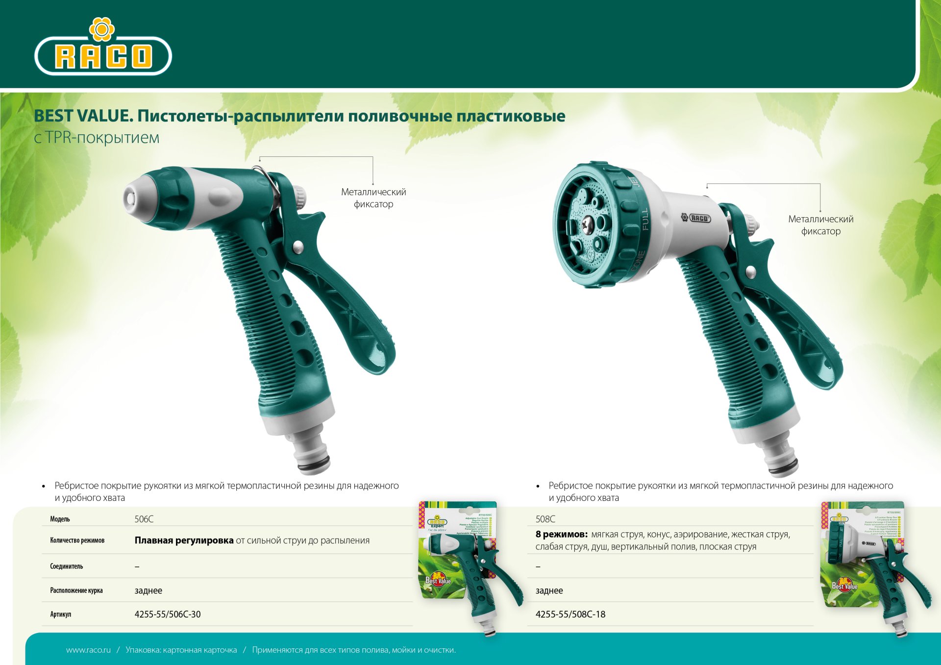 Поливочные пистолеты-распылители RACO Best Value – это оптимальное сочетание цены и качества. Надёжны в работе, служат долго, комфортны в использовании.