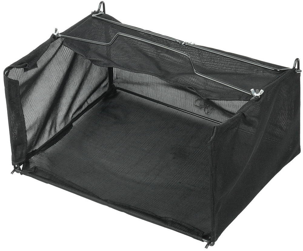 Травосборник подвешивается на ручку газонокосилки при помощи цепочки с кольцом и крепится к раме двумя крюками. Подходит для газонокосилки с шириной рабочей части 355мм.
