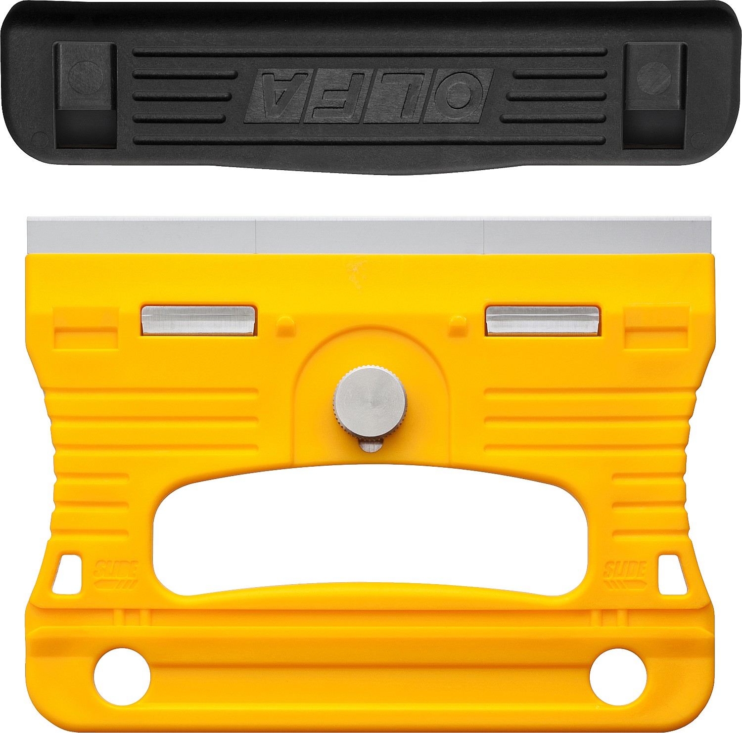 Тонкая конструкция скребка OLFA GSR-1 позволяет наклонять скребок максимально к плоской стеклянной поверхности. Рукоятка и защитная крышка лезвия изготовлены из усиленного фибергласом пластика который известен своей прочностью, жесткостью и устойчивостью к ацетону. Не только лезвие, но и пластина, удерживающая лезвие, и винт изготовлены из нержавеющей стали, поэтому скребок для стекла идеально подходит для работы с водой и жидкостью для мытья посуды.