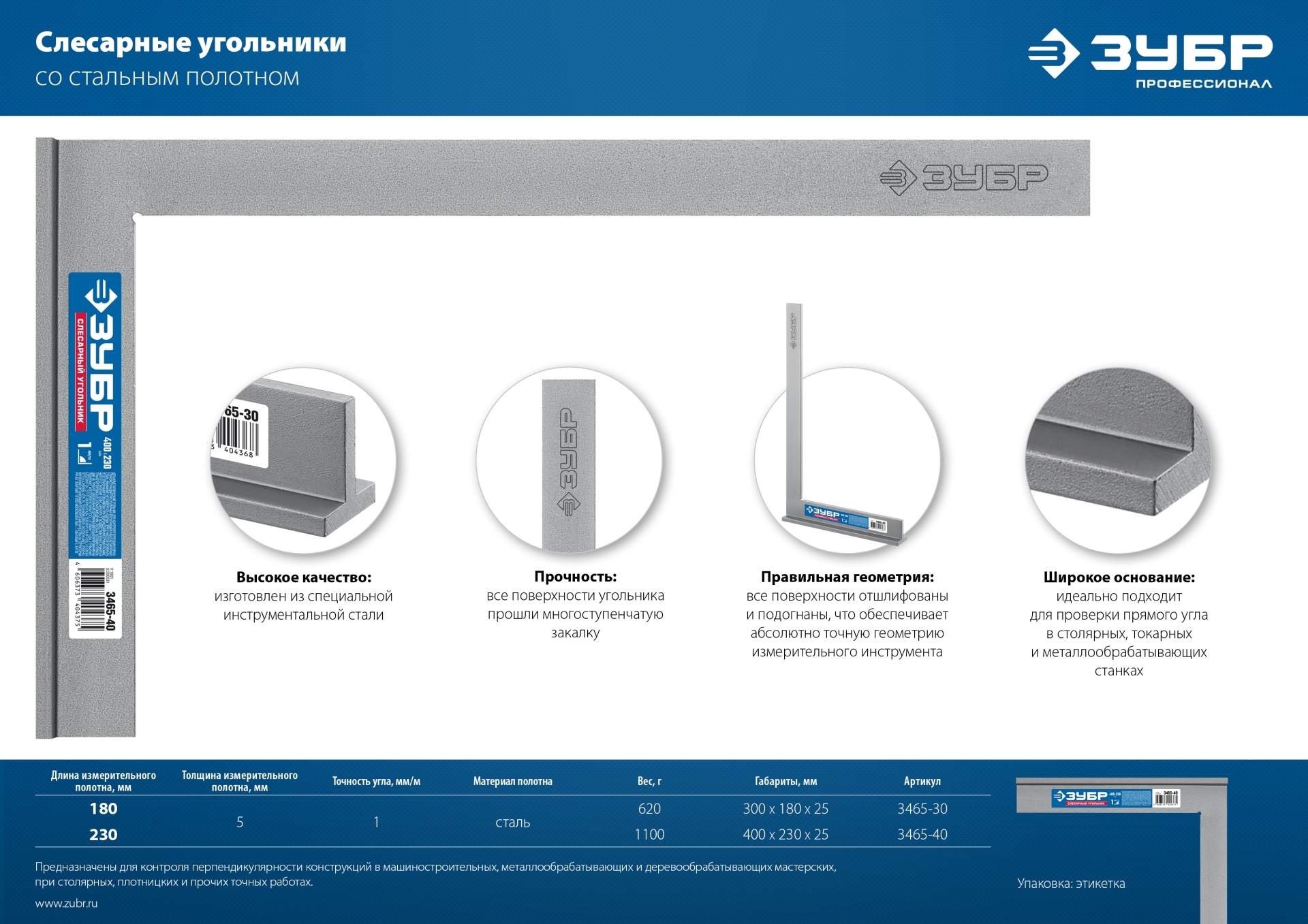Мощный профессиональный цельнометаллический угольник со стальным полотном толщиной 5 мм и широким основанием.