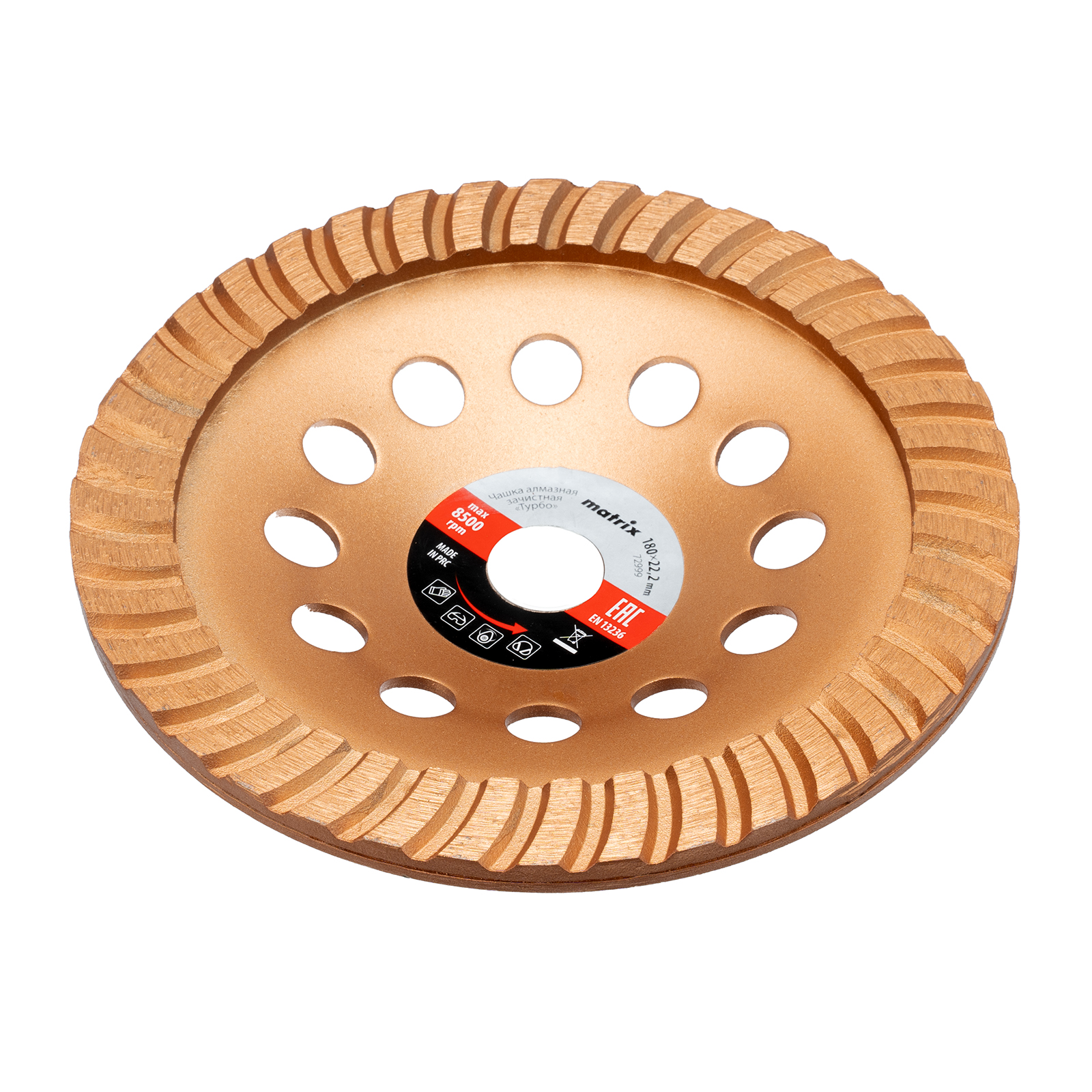 Алмазная зачистная чашка Matrix Turbo 72999 диаметром 180 мм устанавливается на вал углошлифовальной машины, для чего предусмотрено посадочное отверстие 22,2 мм. Используется для придания окончательной гладкости бетонным, каменным, мраморным, гранитным и кирпичным поверхностям, а также для снятия фаски на плитах из гранита или мрамора. Предназначена для профессионального применения.