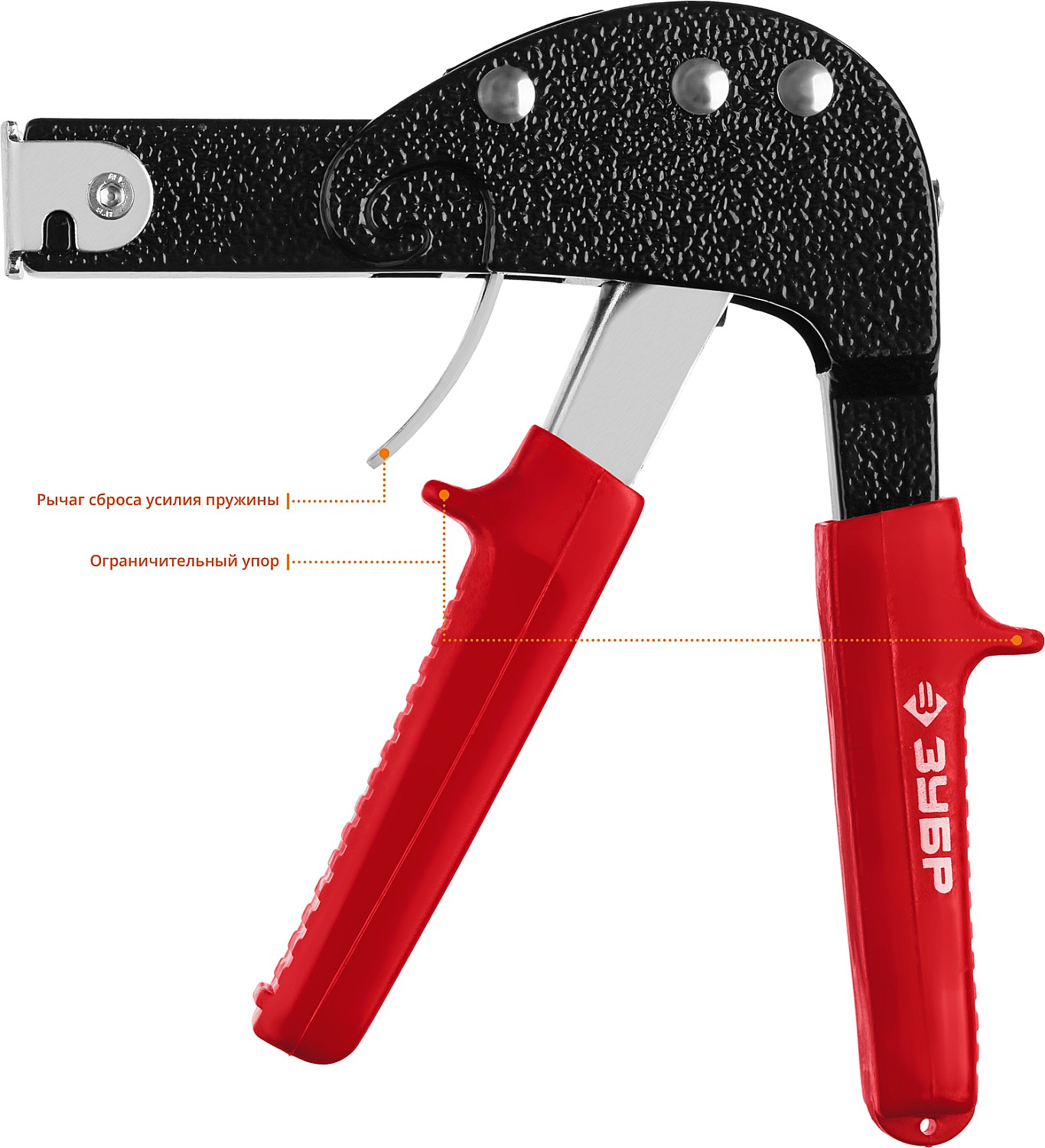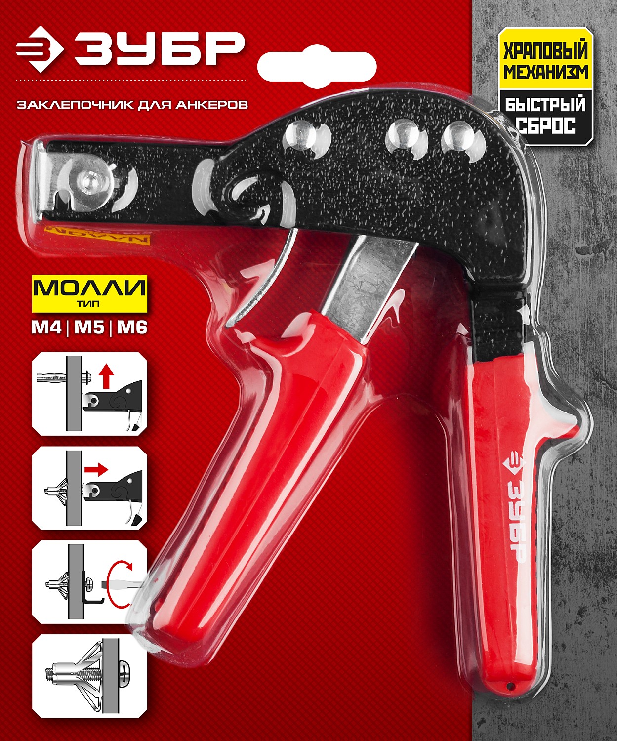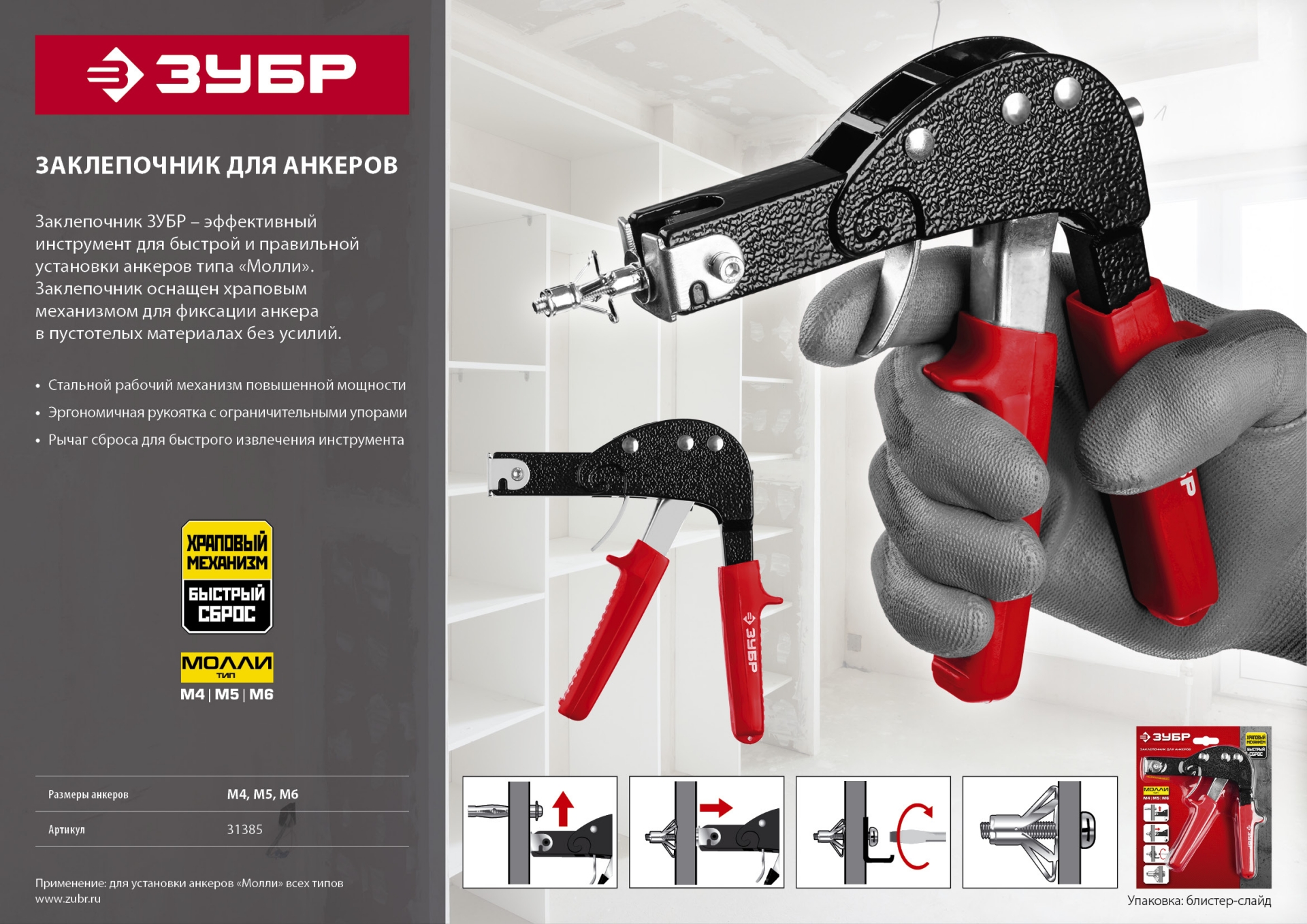 Заклепочник ЗУБР - надёжный и эффективный инструмент для для быстрой и правильной установки анкеров МОЛЛИ. Заклепочник оснащен храповым механизмом, облегчающим зонтичное раскрытие сегментов анкера и его фиксацию в пустотелых материалах.