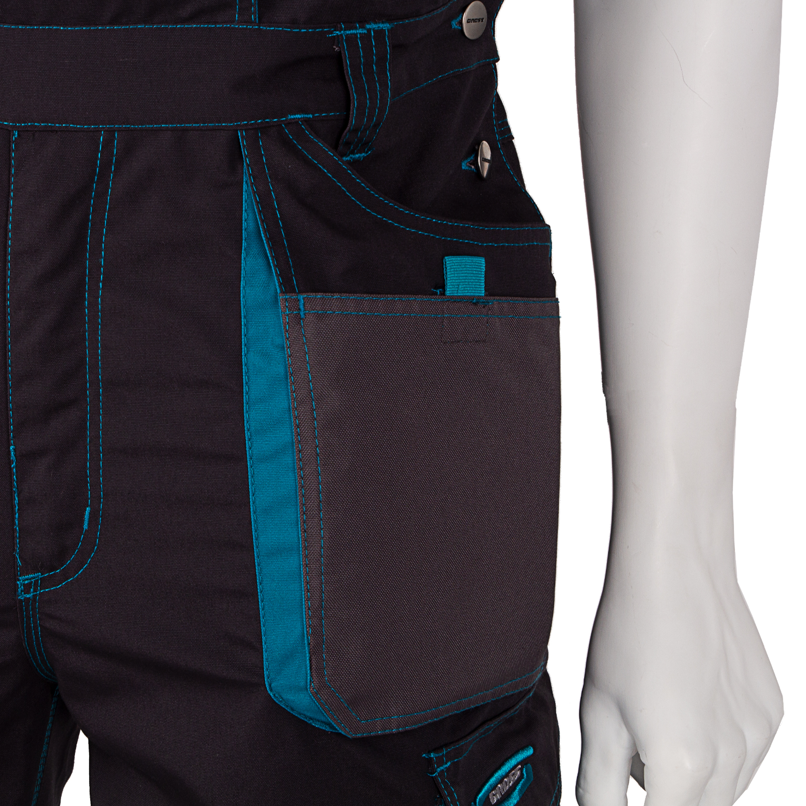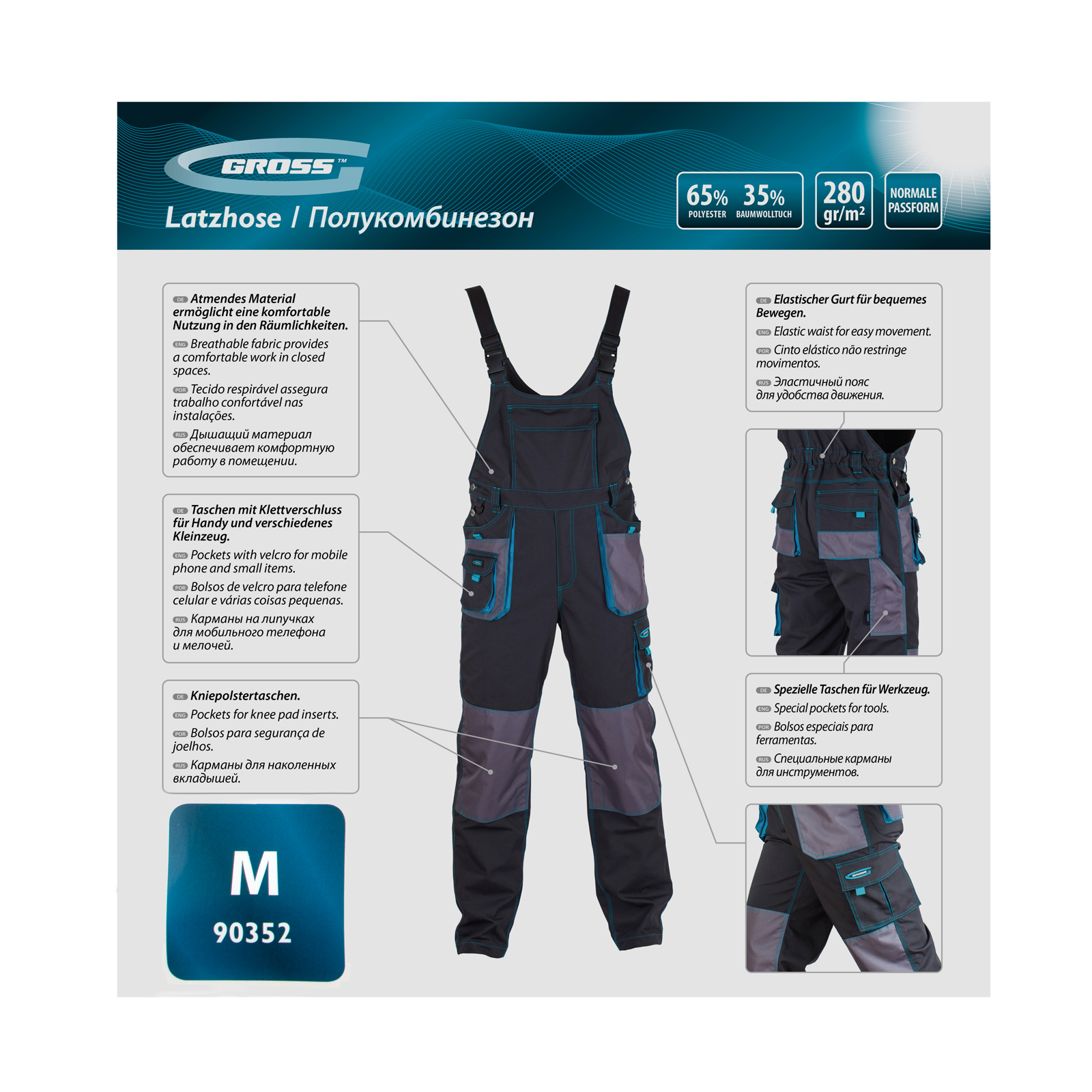 Полукомбинезон Gross 90352 размера M рассчитан на рост 173-179 см и предназначен для защиты рабочего от общих производственных загрязнений и механических повреждений (истираний). Может применяться в отапливаемых помещениях или на улице в теплое время года. Изготовлен из смесовой ткани, содержащей 35% хлопка, что обеспечивает ей дышащие свойства. Полиэстер в составе материала повышает износостойкость спецодежды. Полукомбинезон необходим строителям, электрикам, садовникам, сотрудникам автосервисов, будет полезен и рабочим других специальностей.